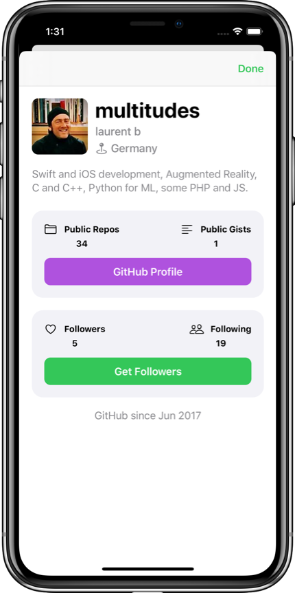 Using the GitHub API, it is built 100% with programmatic UI without storyboards. It displays the followers of an user, allowing to save favorites and visit the profile website of selected users.