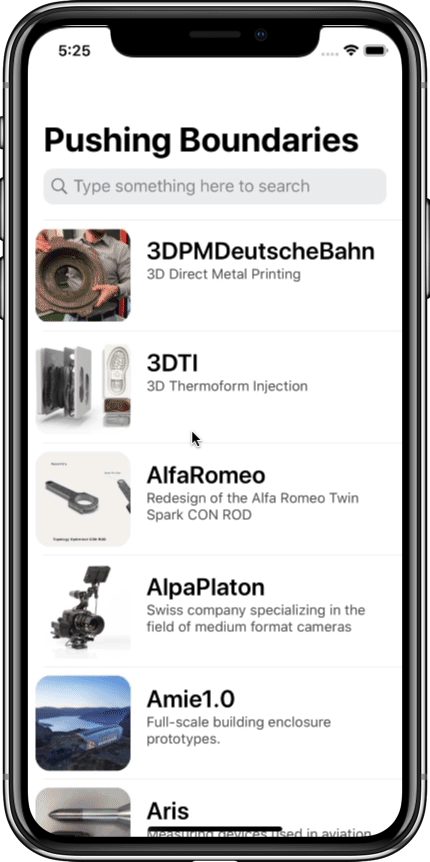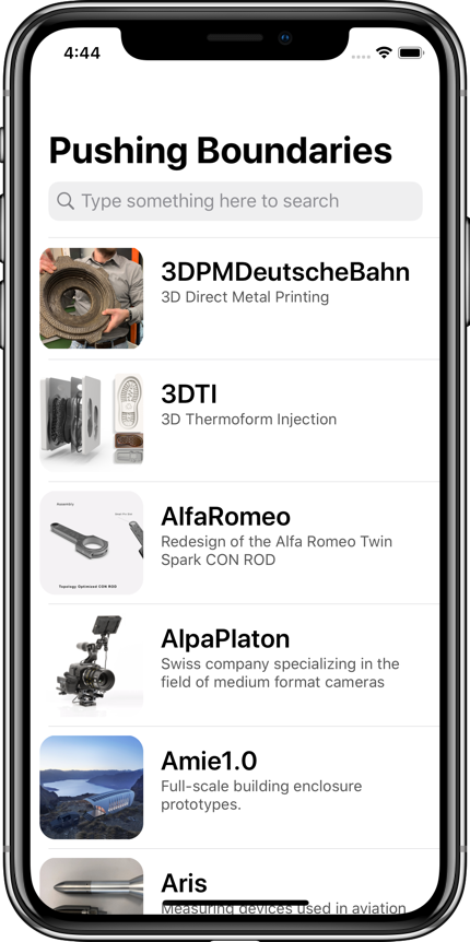 PushingBoundaries is an iOS app for the âPushing Boundariesâ 3D-print model exhibition in Germany, which I recently built during my internship. The specs were to build a basic museum app, and later to extend it with augmented reality. I decided to build something a bit more informative, creative, and colourful than just a basic AR app. The 3D models are organized in a table view for easy scrolling and searching.